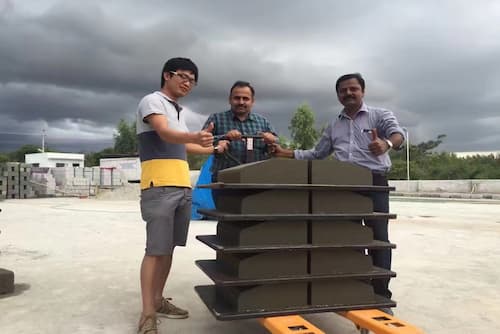В июле 2010 года заказчик обратился к нам в Бангалоре по поводу станка для производства кирпича из золы. Заказчик посетил наш завод и осмотрел работающую площадку, посчитав, что станок QT4-15 с размером поддона 980*560 подходит для его производства.